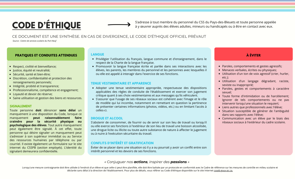 Les membres du personnel sont tenus de respecter un code d’éthique et un code de civilité.